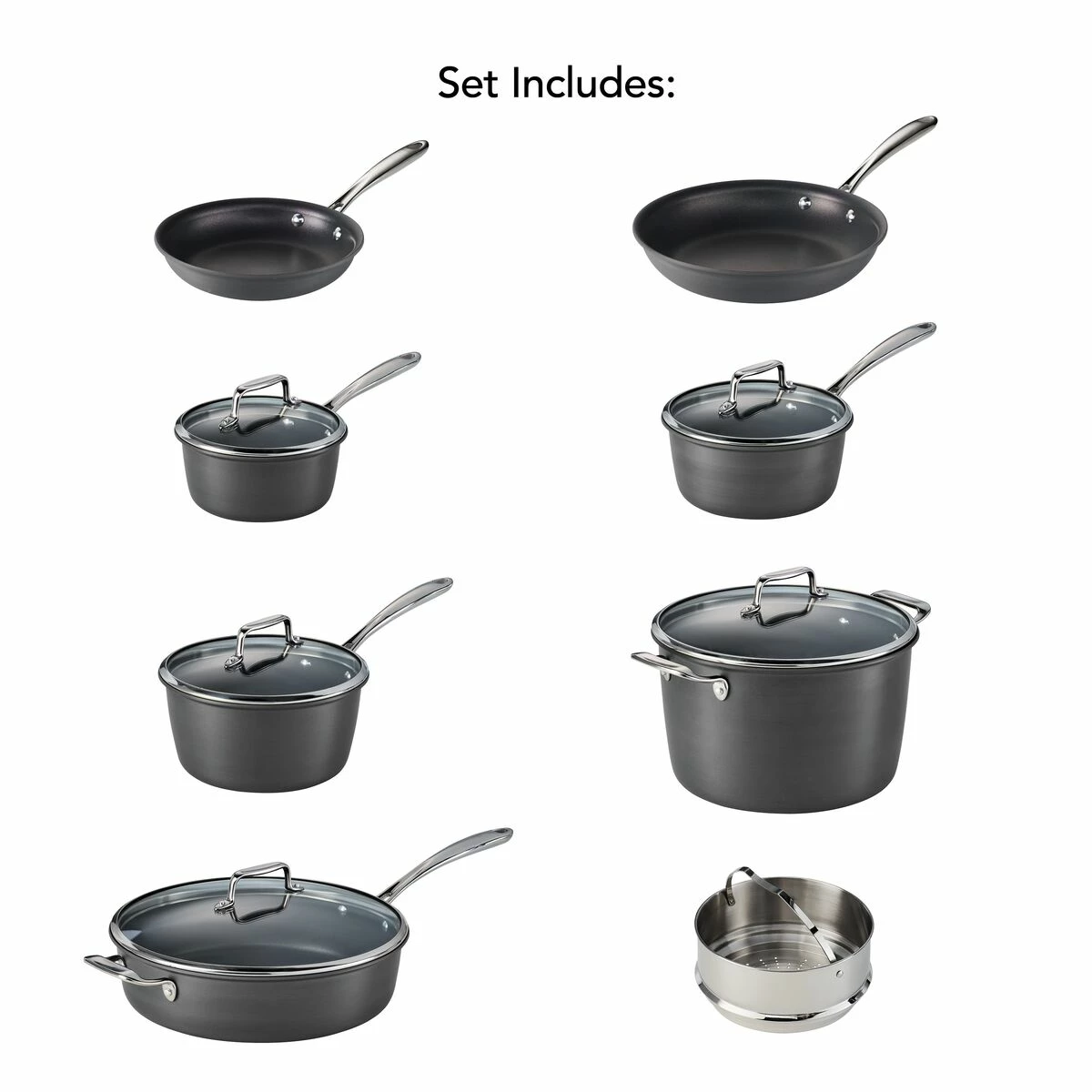 Big families, small restaurants, dinner with your place with friends – Tramontina”s durable, versatile Gourmet 13 Pc Hard Anodized Aluminum Nonstick Cookware Set can stand up to it all. Made from heavy-duty, hard-anodized aluminum, each piece in the set is made to conduct heat evenly and quickly. Hard anodized cookware is known for its durability, resistance to scratching, and versatility. A smooth, dark gray, fine satin finish covers the cookware”s exterior, while a reinforced nonstick coating covers the interior for quicker, cleaner, and healthier cooking. Maneuver your pots and pans with ease, thanks to precision-cast, mirror-polished, stainless-steel long and side handles. You”ll be able to watch your cooking progress through heat- and shatter-resistant tempered glass lids with stainless-steel rim that features a fine satin finish. The set is compatible with gas, electric, and ceramic glass cooktops, and oven-safe up to 350°F / 176°C. Hand-wash to clean. This set includes all the essential pieces you need to prepare everything from breakfast to dinner.